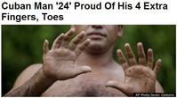 총 24개의 손가락과 발가락을 가진 남성이 화제다. 그는 일반인과 달리 손과 발에 각각 하나씩 손ㆍ발가락이 더 달려있다. 최근 [AP통신] 등 외신은 “쿠바의 동북쪽 끝에 위치한 바라코아라는 작은 도시에 요안드리 헤르난데스 가르리도(37)라는 남성이 태어날 때부터 손