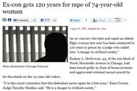 70대 노인 여성을 성폭행한 40대 남성이 종신형과 다름 없는 징역 120년을 언도 받았다.시카고트리뷴은 25일자 보도를 통해 "미국 일리노이 주(州) 케인 카운티의 티모시 쉘던(Timothy Sheldon) 판사는 늙은 과부의 집에 몰래 들어가 강간한 혐의로 기소된