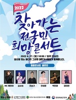 대한가수협회가 주최하는 '찾아가는 전 국민 희망 콘서트'가 오는 27일 오후 6시 청주 무심천공원에서 열린다.올해 들어 11번째로 열리는 이번 공연은 '트롯신이 떴다'에서 발굴의 노래실력을 뽐낸 가수 '혜진이'가 MC를 맡아 무대의 흥을 돋울 예정이다.또한 '남행 열차