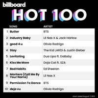 그룹 방탄소년단(BTS)이 파죽지세로 10주 연속 미국 빌보드 메인 싱글 차트 '핫 100'에서 정상의 자리를 지켰다.미국 빌보드는 2일(현지시각) 공식 홈페이지에 게시한 기사를 통해 "방탄소년단의 디지털 싱글 '버터(Butter)'가 최신 차트(8월 7일자)에서 통산