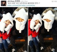 배우 천정명이 김민정과 찍은 귀요미 셀카를 공개해 눈길을 끌고있다.지난 18일 천정명은 자신의 트위터에 "'밤의 여왕' 여신 김민정 양과 촬영 중 한 컷"이라는 멘션과 함께 한 장의 사진을 게재했다.사진 속에는 천정명과 김민정이 귀가 달린 귀여운 하얀색 모자와 장갑