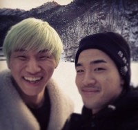 태양 대성 셀카가 공개됐다.빅뱅의 멤버 태양은 지난 2일 자신의 트위터에 "지용이네"라는 짧은 글과 함께 사진 한 장을 게재했다.공개된 사진 속 태양과 대성은 흰 눈이 쌓인 풍경을 뒤로하고 환한 웃음을 지으며 카메라를 응시하고 있다. 특히 무대에서의 화려한 모습이 아