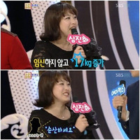 "우리나라에서 최초로 임신을 하지 않고 결혼 후 17㎏이 쪘다. 한 아저씨 팬이 ‘순산하세요’라고 말했다."개그우먼 심진화가 16일 방송된 SBS ‘도전 1000곡’에 출연해 개그맨 김원효와 결혼한 후 불어난 몸무게를 언급했다. "요즘 살이 많이 올랐다"는 MC 이휘재