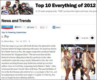 싸이가 올해의 벼락스타로 선정돼 화제다.미국 시사주간지 '타임'은 5일(현지시각) 경제와 정치 문화예술 등 사회 전체 55개 분야에서 올해 최고의 인물과 화제를 10위까지 선정해 '2012 최고, 최악의 톱10'을 발표했다.이 중 싸이는 '최고의 벼락스타(Fleetin