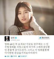 걸그룹 미쓰에이 수지의 개념 발언이 화제다. 수지는 27일 자신의 트위터에 “영화 ‘26년’ 꼭 봐라! 지금도 광주에는 그 민주항쟁 때를 자랑스럽게 여기며 그때 희생당했던 분들께 감사드린다. 그리고 이 영화를 통해 다시 한 번 관심을 가져보아야겠다”는 글을 게재했다.수