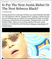 미국의 유력 경제지 포브스가 또다시 싸이에 대한 진단 기사를 실어 눈길을 끌고 있다.포브스는 지난 25일 홈페이지를 통해 '싸이가 제2의 저스틴 비버가 될까, 레베카 블랙이 될까?(Is Psy The Next Justin Bieber Or The Next Rebecca