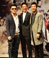지난 21일 오전 서울시 광진구 롯데시네마 건대점에서 열린 영화 '퍼펙트 게임'제작발표회서 배우 조승우, 양동근, 박희곤 감독이 포토타임을 갖고 있다. '퍼텍트 게임'은 1987년 5월16일 영화보다 더 영화 같았던 롯데 최동원과 해태 선동열의 마지막 승부를 감동적으