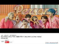 그룹 방탄소년단의 활동곡 '작은 것들을 위한 시(Boy With Luv)' 뮤직비디오가 조회수 3억뷰를 돌파했다. 방탄소년단이 지난 4월 12일 발매한 '맵 오브 더 소울 : 페르소나(MAP OF THE SOUL : PERSONA)'의 타이틀곡 '작은 것들을 위한 시