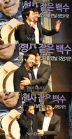 영화 '반가운 살인자'의 두 주인공 유오성(우)과 김동욱(좌) ⓒ 뉴데일리 10일 이화여고 100주년 기념관에서 열린 영화 '반가운 살인자' 제작보고회에서 배우 유오성과 김동욱이 함께 포즈를 취하며 부끄러워 하고 있다.이날 사회를 맡은 개그우먼 안영미는 포토라인에 선