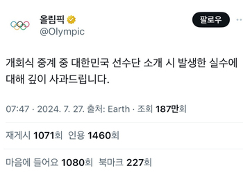 2024 파리 올림픽 개회식에서 대회 조직위원회가 '한국'을 '북한'이라고 소개해 큰 논란이 되고 있다.지난 27일(한국시각) 프랑스 파리에서 열린 개회식을 중계한 장내 아나운서가 206개 출전국 중 48번째로 등장한 대한민국 선수단을 가리켜 프랑스와 영어로 각각 'R