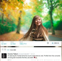 영국 가수 코니 탤벗이 내한공연을 앞두고 진도 여객선 세월호 침몰 사고에 기부의 뜻을 밝혔다. 코니탤벗은 19일 자신의 트위터에서 "슬픈 시기를 맞은 한국으로 내일 떠난다. 콘서트 수익금은 여객선 사고에 기부할 것이다(I'm leaving for Korea tomorr