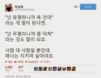 곽정은이 악플러들에게 법적대응을 시사한 가운데 하상욱 시인이 이에 힘을 실어주는 듯한 의미심장한 글을 남겼다.하상욱 시인은 6일 자신의 트위터에 "'넌 유명하니까 욕 견뎌'라는 게 말이 된다면 '넌 무명이니까 좀 닥쳐'라는 것도 말이 되죠. 사람 대 사람일 뿐인데 매너