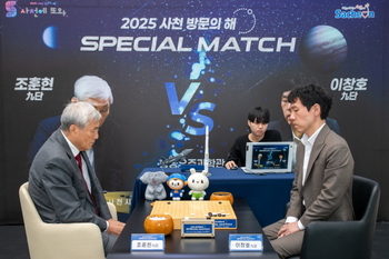한국 바둑의 '전설' 이창호 9단이 다시 한번 '스승' 조훈현 9단을 꺾었다.17일 경남 사천시 항공우주과학관에서 열린 '2025 사천 방문의 해, SPECIAL MATCH'에서 이창호 9단이 조훈현 9단에게 173수 만에 흑 불계승을 거뒀다.김제홍 사천시 부시장의 대