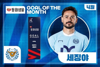 대구FC 공격수 세징야가 2025시즌 4월 K리그 '안심을 마시다 동원샘물 이달의 골'을 수상했다.동원F&B가 후원하는 '안심을 마시다 동원샘물 이달의 골'은 매월 가장 인상 깊은 득점을 터뜨린 선수에게 수여하는 상이다. 두 명의 후보를 대상으로 K리그