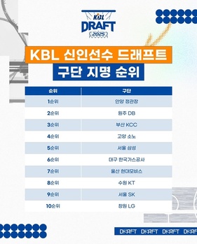 한국프로농구 안양 정관장 레드부스터스가 7%의 확률을 뚫고 2년 연속으로 KBL 신인선수 드래프트 1순위 지명권을 가져갔다.연합뉴스 등에 따르면 7일 서울 강남구 KBL센터에서 열린 2025 KBL 신인선수 드래프트 구단 순위 추첨에서 정관장이 1순위 지명권을 얻었고,