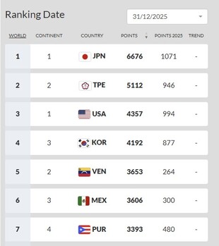 한국 야구가 세계야구소프트볼연맹(WBSC) 랭킹 4위로 2025년을 마감했다.WBSC는 지난달 31일 남자 야구 세계랭킹을 발표했다. 최근 4년 동안 얻은 점수로 정한 순위에서 한국은 4192점으로 4위에 자리했다. 올해 얻은 포인트도 877점으로 네 번째로 많았다.한