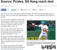 【뉴데일리 스포츠】넥센 히어로즈의 강정호(27)가 미국 프로야구 피츠버그 파이어리츠와 4년간 174억 원에 계약을 체결할 것이라는 보도가 지난 12일 미국 언론을 통해 나왔다. ESPN은 한국의 유격수 강정호와 피츠버그가 계약을 체결할 것이라고 밝혔다. 강정호는 14일
