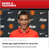 스페인 레알 마드리드의 '아르헨티나 특급스타' 앙헬 디 마리아가 잉글랜드 프리미어리그 사상 최고의 이적료 기록을 세우며 맨체스터 유나이티드(이하 맨유) 이적을 확정했다.맨유는 27일(한국시간) 구단 공식 홈페이지를 통해 디 마리아 영입을 발표했다. 계약 기간은 5년,