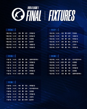 한국프로축구연맹이 '하나은행 K리그1 2025' 파이널라운드 일정을 20일 발표했다. 파이널라운드는 정규라운드 종료 후 상, 하위 각 6개 팀으로 나뉘어 진행되며, 34라운드부터 38라운드까지 각 팀이 5경기씩 치른다.파이널A 6개 팀 중 조기 우승을 확정한