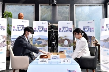 '바둑 황제' 신진서 9단이 '바둑 여제' 최정 9단과의 보령 빅매치 1국에서 역전 반집승을 거뒀다.19일 충남 보령시 무창포타워 전망대에서 열린 '충남 방문의 해, 보령 BIG MATCH' 1국에서 신진서 9단이 최정 9단에게 296수 만에 흑 반집승을 거두며 기선