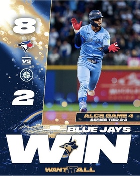 토론토 블루제이스가 2025 미국프로야구 메이저리그(MLB) 포스트시즌(PS) 아메리칸리그 챔피언십시리즈(ALCS, 7전 4승제)에서 2연패 후 2연승을 거두며 시리즈를 원점으로 돌려놨다.연합뉴스 등에 따르면 토론토는 17일(한국시각) 미국 워싱턴주 시애틀 T-모바일