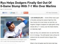 "류현진, 다저스 구세주 됐다!" 4승 달성..8연패 사슬 끊어메이저리그에 갓 입성한 [신인] 류현진(26·LA다저스)이 팀을 [8연패의 늪]에서 구해냈다.12일(이하 한국시각) 미국 캘리포니아주 로스앤젤레스 다저스타디움에서 열린 2013 메이저리그 와의 홈경기에 선발