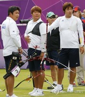 남자양궁 단체전 금메달이 좌절됐다. 29일(한국시간) 영국 런던 로즈 크리켓 그라운드에서 열린 2012 런던올림픽 양궁 남자단체전 준결승에서 미국에 219대224로 패했다. 김법민, 오진혁, 임동현으로 구성된 대한민국 남자 양궁 대표팀은 아쉬운 경기력을 보였다. 세계