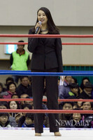 (전남 고흥=고경수 기자) 17일 오후 2시 전남 고흥군 거금도에서 ‘영원한 박치기왕’ 김일 기념체육관 개관식 및 세계프로레슬링 대회가 열린 가운데 장내 아니운서 김경지가 진행을 보고 있다.…