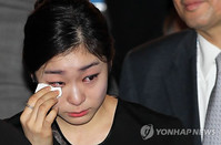 평창유치위 홍보대사인 김연아가 6일(현지시간) 남아프리카공화국 더반 국립컨벤 센터에서 열린 2018동계올림픽 개최도시 발표식에서 평창 유치가 발표된 뒤 눈물을 닦으며 걸어나오고 있다. (연합뉴스)