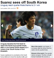 한국이 이번 남아공월드컵에서 다크호스로 떠오른 우루과이를 맞아 시종 압도적인 우세를 보이며 경기를 주도하다 루이스 수아레스에게 연속골을 허용하며 통한의 패배를 당한 것에 대해 외신들도 놀라움을 감추지 못하고 있다.미국의 월스트리트 저널은 경기 직후 긴급속보를 타전, "