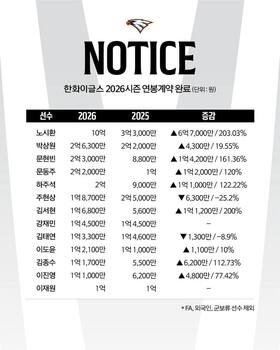 한화 이글스는 21일 재계약 대상자 62명에 대한 연봉 계약을 완료했다.대상자 중 팀 내 최고 연봉자는 노시환으로, 지난해 3억 3000만원에서 6억 7000만원 인상된 10억원에 계약했다. 이는 팀 내 최고 인상률(약 203%)이자 최대 인상액이다.통산 830경기에서