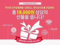 이 [마이원 모바일 월렛]과 함께하는 뷰티포인트 제공 이벤트를 진행한다. [마이원 모바일 월렛]은 다음커뮤니케이션(대표 최세훈)에서 출시한 모바일 애플리케이션으로, 신용∙체크카드에 다양한 멤버십을 연결해 카드 한 장으로 결제와 포인트 적립을 할 수 있는 서비스다. 은