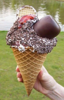 다 못 먹을 아이스콘이 등장했다. 최근 한 온라인 커뮤니티 게시판에는 [다 못 먹을 아이스콘]이란 제목으로 한 장의 사진이 올라왔다. 공개된 사진에는 와플에 파르페, 아이크림콘을 섞어 놓은 거대한 초코 아이스크림의 모습이 담겨 있다. 이 아이스크림은 덴마크에서 제조된