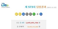 2013년 11월 23일 실시된 제573회 나눔로또 1등 당첨번호는 ‘2, 4, 20, 34, 35, 43’이며, 2등 보너스 번호는 14번이다. 이번 로또 573회차 추첨 결과 1등 당첨자는 8명으로 16억4569만1766원의 당첨금을 받게 됐다. 1등 번호 중개와