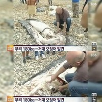 180kg 괴물 오징어가 발견됐다. 최근 각종 온라인 커뮤니티 게시판에는 [180kg 괴물 오징어]라는 제목으로 사진이 올라와 눈길을 끌었다. 공개된 사진은 지난 2일(현지시간) 스페인 깐따브리아의 해안에서 파도에 밀려온 오징어 사체의 모습이 담겨 있다.180kg 괴물