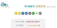 2013년 10월 19일 실시된 제568회 나눔로또 1등 당첨번호는 ‘1, 3, 17, 20, 31, 44’이며, 2등 보너스 번호는 40번이다. 이번 로또 568회차 추첨 결과 1등 당첨자는 10명으로 13억516만7550원의 당첨금을 받게 됐다. 1등 번호 중개와
