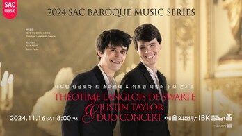 바로크 음악계 라이징 스타인 바이올리니스트 테오팀 랑글로아 드 스와르테와 하프시코디스트 쥐스탱 테일러가 한국에서 첫 듀오 무대를 선보인다.예술의전당은 오는 16일 오후 8시 IBK챔버홀에서 2024 SAC 바로크음악시리즈 '테오팀 랑글로아 드 스와르테 & 쥐스탱