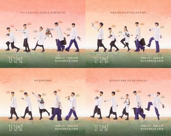뮤지컬 '긴긴밤'이 2026시즌 개막을 앞두고 주요 인물 5인이 함께 등장하는 단체포스터 4종을 공개했다이번 포스터는 작품 속 주요 캐릭터 윔보·치쿠·펭귄·노든·앙가부가 나란히 걸어가는 모습을 그려냈다. 긴긴밤을 함께 건너 바다로 향해 나아가는 여정을 은유적으로 표현했