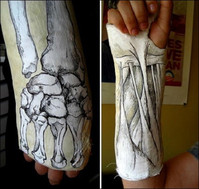 미대생의 흔한 깁스 2탄이 공개됐다. 최근 한 온라인 커뮤니티 게시판에는 [미대생의 흔한 깁스 2탄]이라는 제목으로 한 장의 사진이 올라왔다. 공개된 사진에는 다쳐서 깁스를 하고 있는 팔에 그림이 그려져 있다. 특히, 흰색 석고 깁스 바깥쪽에는 뼈를, 안쪽에는 근육을
