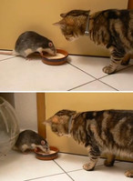 고양이 밥 뺏는 쥐, 먹이 앞에선 ‘눈에 뵈는 게 없어’