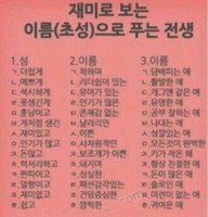 이름의 초성으로 전생을 알아보는 게시물이 화제다. 최근 각종 온라인 커뮤니티 게시판에는 [초성으로 푸는 전생]이라는 제목으로 사진 한 장이 올라와 네티즌들의 관심이 쏠렸다. 초성으로 푸는 전생 방법은 간단하다. 각자 이름의 초성을 도표에서 찾아 단어를 조합해보면 전생에