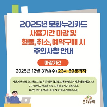 한국문화예술위원회(이하 예술위)는 2025년 문화누리카드 이용 마감이 오는 31일까지며, 올해 문화누리카드 지원금 14만 원을 연말까지 사용해야 한다고 24일 밝혔다.합문화이용권(문화누리카드)은 취약계층의 삶의 질 향상과 문화 격차 완화를 위해 국내 문화예술·여행·체육