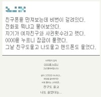[슬픈 비밀번호]가 온라인상에서 화제다.최근 온라인 게시판에는 [친구 핸드폰 비밀번호]라는 제목으로 한 장의 사진이 공개됐다.게시물에는 친구의 휴대전화에 걸려있는 비밀번호를 푸는 과정에서 생긴 사연이 담겨 있다.해당 글 작성자는 친구의 휴대전화 비밀번호를 친구에게 물었