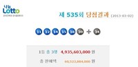2013년 3월 2일 실시된 제535회 나눔로또 1등 당첨번호는 '11, 12, 14, 15, 18, 39'번이며, 2등 보너스 번호는 34번이다. 이번 로또 535회차 추첨 결과 1등 당첨자는 3명으로 49억3560만3000원의 당첨금을 받게 됐다.1등 번호 중 5개