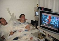 ‘4D로 보는 스파이더맨’사진이 공개됐다. 최근 한 온라인 커뮤니티 게시판에는 ‘4D로 보는 스파이더맨’이라는 제목으로 사진 한 장이 올라왔다. 공개된 사진에는 두 남성이 온 몸에 붕대 테이프를 칭칭 감고 영화 ‘스파이더맨’을 감상하고 있는 모습이 담겨 있다. 특히,