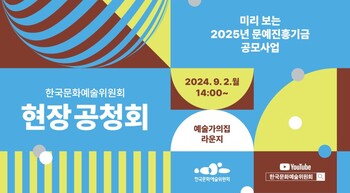 한국문화예술위원회(이하 예술위)는 9월 2일 오후 2시부터 서울 예술가의집 라운지에서 '2025년 문예진흥기금 공모사업 현장 공청회'를 연다.예술위는 지난 3월 개최된 '현장 업무보고'를 시작으로 총 32회에 걸쳐 분야별 라운드테이블을 추진하면서 약 170여 명의 전문