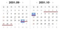 '2031년만 같아라' 게시물이 화제다.최근 온라인 커뮤니티 게시판에는 '2031년만 같아라'라는 제목으로 사진이 게재됐다.공개된 '2031년만 같아라' 사진에는 2031년 9월과 10월의 달력 모습이 담