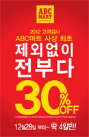 슈즈쇼핑센터 ABC마트가 2012년 마지막을 화려하게 장식하는 파격 ‘연말 특별세일’을 진행한다.ABC마트는 28일부터 2012년의 마지막 날인 31일까지 4일간, 브랜드, 카테고리와 관계없이 입점된 모든 제품을 무조건 30% 할인된 가격에 판매한다.할인 제외