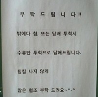 ‘PC방 주인의 부탁’이 화제가 되고 있다.최근 한 온라인 커뮤니티 게시판에는 ‘PC방 주인의 부탁’이라는 제목의 게시물이 게재됐다.공개된 ‘PC방 주인의 부탁’ 게시물 속에는 “부탁드립니다! 밖에다 침, 또는 담배 투척시 수류탄 투척으로 답해 드립니다. 팀킬 나지 않