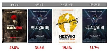 뮤지컬 '하데스타운·'엑스칼리버'·'헤드윅'이 하반기 기대작 1위에 등극했다.인터파크는 관객 1992명을 대상으로 8월 이후 개막하는 뮤지컬 중 관객들이 가장 관람하고 싶은 작품을 조사해 19일 발표했다. 조사는 8월 13~14일 진행됐으며, 초연·창작·라이선스·대극장